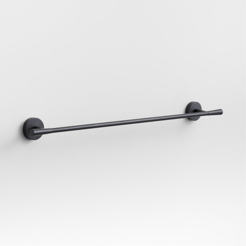 Sometimes it's the small things that pull a room together. That's why we've designed a hardware collection with modern silhouettes, clean lines and a touch of tradition to give your bathroom that perfect finishing touch. Made of brass with a chic matte black finish, the stylish towel bar caps the hanging rod with subtly tapered finials. Cylindrical posts anchored with scaled-up round rosette bases provide a graphic look with modern proportions. Also available in a shorter length, the 24-inch towel bar is ready to be wall mounted with included hardware.