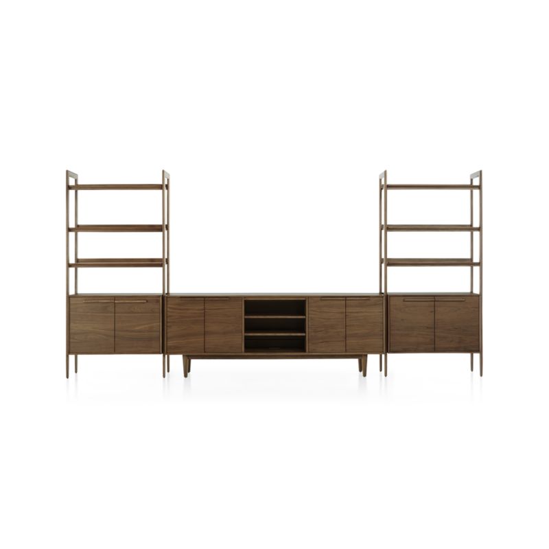 The bookcases feature cabinets with sleek flat-front doors and linear undercut pulls that showcase Tate's beautiful walnut veneer. Designed by Blake Tovin of Tovin Design, the Tate Walnut 80" Media Console with 2 Bookcase Cabinets is a Crate and Barrel exclusive.