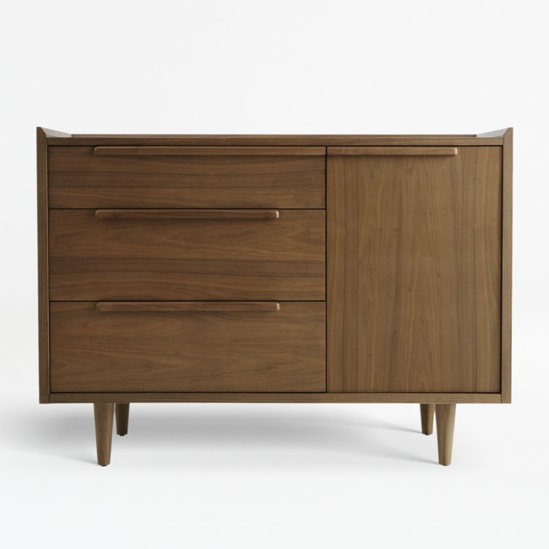 Our 1960s-inspired Tate three-drawer chest recalls the timelessness of mid-century design with a tailored profile and streamlined shape. Crafted of solid walnut and walnut veneer, the chest showcases gallery fronts and linear undercut drawer pulls supported by tapered turned legs.