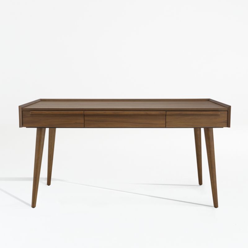 Our 1960s-inspired Tate desk recalls the timelessness of mid-century design with a tailored profile and streamlined shape. Crafted of solid walnut and walnut veneer, the desk showcases three drawers united by linear undercut drawer pulls that run the length of the desk.