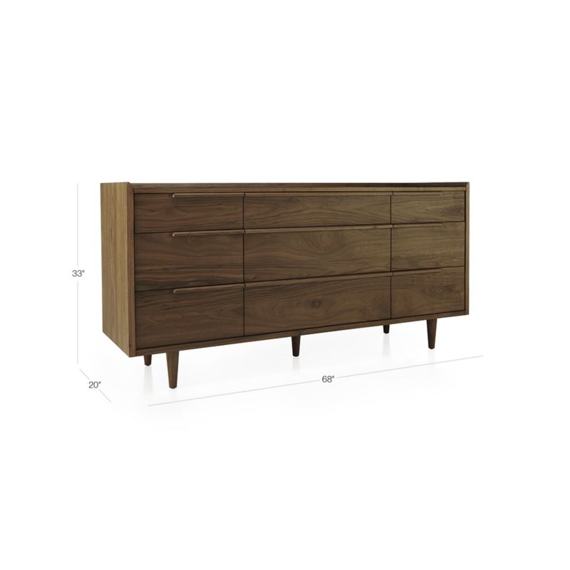 The horizontal dresser presents a continuous front with nine drawers of varying size. Designed by Blake Tovin, the Tate 9-Drawer Chest is a Crate and Barrel exclusive.