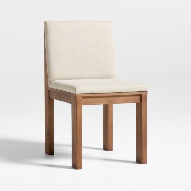 Crafted of solid white oak with a warm brown finish applied by hand, our Terra dining chair celebrates the rustic beauty of wood. The chair's dynamic, angular look features square legs that extend to the top of the wood panel back. Clean-tailored seat and back cushions upholstered in a cotton-blend ensure a comfortable stay. For a coordinated kitchen or dining room, pair the chairs with our warm brown Terra dining table.