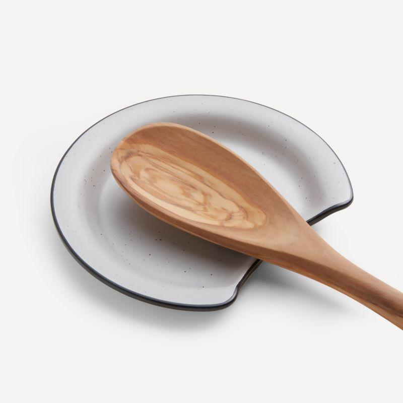 Our ceramic Thero spoon rest protects your counters or stovetop from saucy spoons and hot tongs as you cook. Glazed with dainty black speckles on matte white, the stoneware dish offers a classic look in kitchen-friendly black and white. The slender outline finishes the rimmed circle with a crisp matte black detail, while a cutout accommodates utensil handles. For a unified look, pair the white spoon rest with the other pieces in our exclusive Thero kitchen collection.