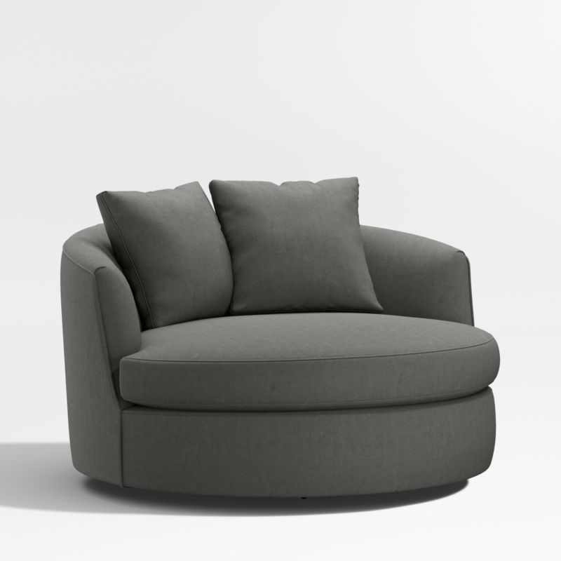 Round out your living room with the contemporary curves of Tillie. With enough space for two, this roomy swivel chair beckons you to kick off your shoes and snuggle up in the round. The swivel base lets you follow the conversation or rotate for a new view. A tight barrel back completes the circle, while soft throw pillows nestle a comfy seat. The Tillie Grande Swivel Chair is a Crate and Barrel exclusive.