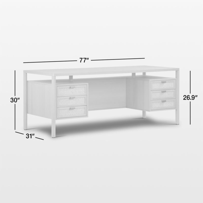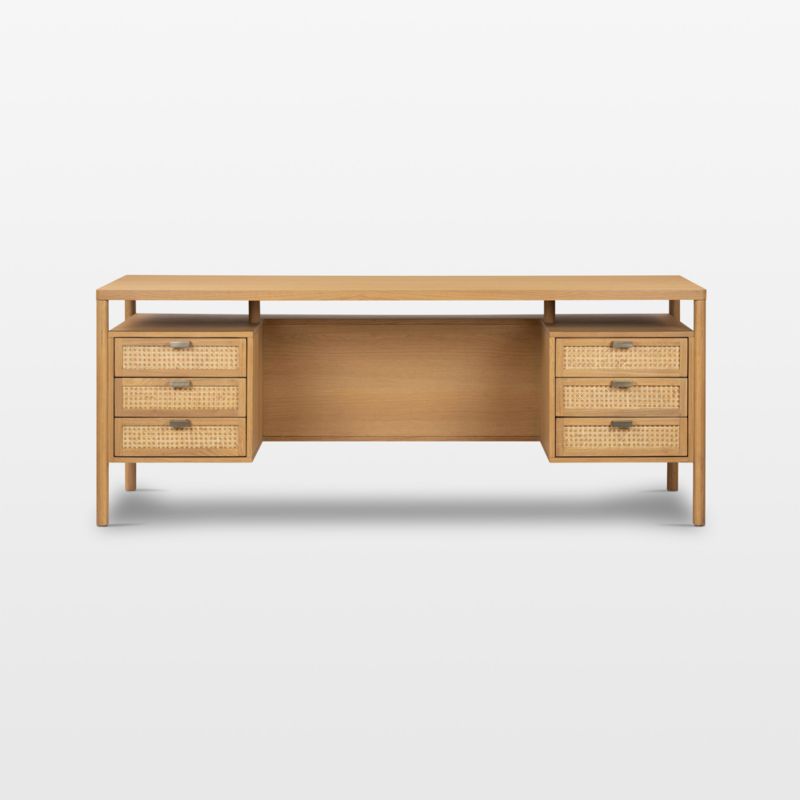 On-trend cane lends a coastal feel to our Tisdell wood desk. Warmed by a khaki-toned finish, the solid oak and oak veneer frame floats two sets of drawers, each fronted in woven cane and accented with mid-century, aged-brass tab pulls. The solid wood top hovers, creating an open shelves on top of the drawer sets for stashing laptops or pads of paper. Dowel legs and a partial panel black add to the desk's airy, casual appeal.