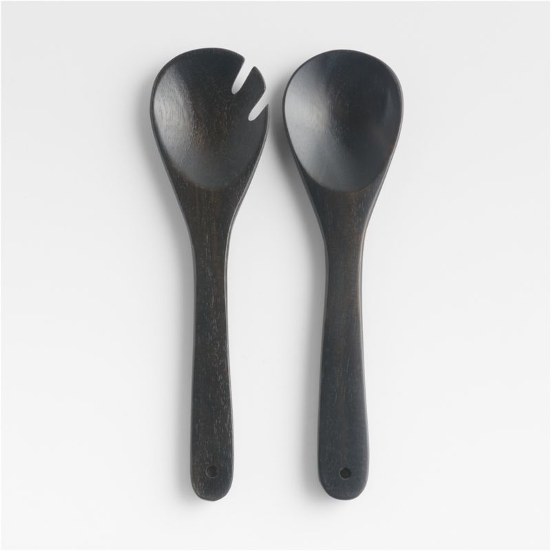 Serve kale, roasted vegetable or cucumber salads with this stunning set of servers. Carved by hand of solid acacia wood with a dramatic black finish, the pair boasts comfortable handles and generously sized bowls for easy scooping and serving. The hand-finished set makes a lovely housewarming or wedding gift, especially paired with a salad bowl or other ebonized pieces from our exclusive Tondo serving collection.