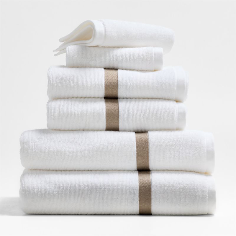 Our tuxedo towel collection dresses up your bathroom for a chic and put-together look. Inspired by timeless formal wear, two beige embroidered stripes detail each of these organic cotton bath towels. Sandy embroidery contrasts warmly with the bright white, densely looped terrycloth for indulgent towels that look sophisticated and feel irresistibly soft and absorbent. Pair the set of six with the coordinating bath mat to outfit a bathroom that's impeccably tailored and always in style.