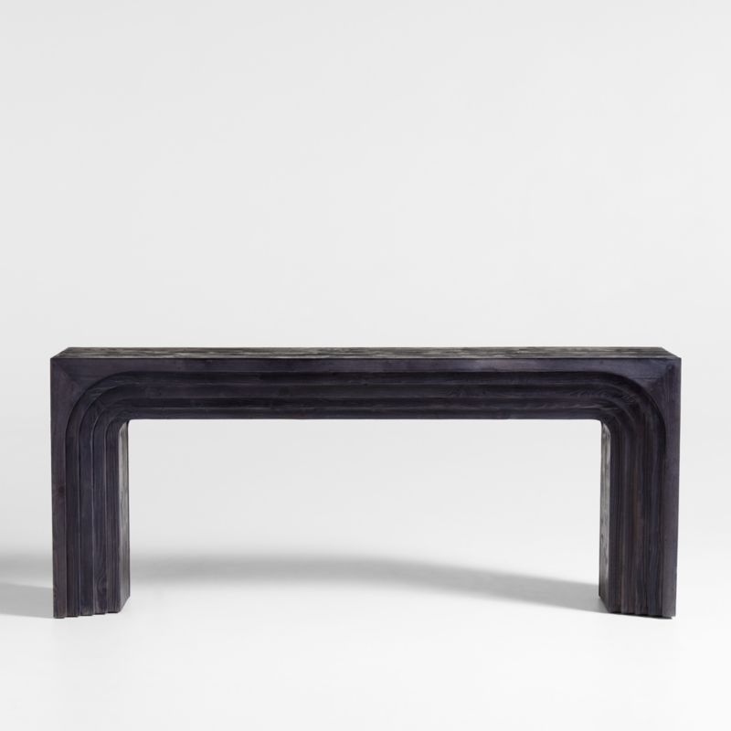 Art Deco meets Italian architecture in our statement-making Valo console table. Recalling the look of sculpted fireplaces, grand interior archways or geo-forward building embellishments, the solid pine table accents its waterfall silhouette with a graduated stepped motif on either side. An ebonized finish enhances the dynamic silhouette as well as the intriguing wood grain. A great look from any angle, the pine console table makes an impact in an entryway or behind a sofa.