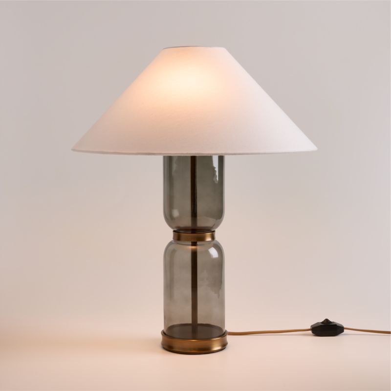 Velato encases a typical table lamp in sculptural glass to create something unexpected. Rising from a burnished brass-finished base, a column of smoky slate grey glass surrounds the slender central stem. A gleaming metal ring cinches the tube to create clean curves and a striking silhouette. The white fabric shade diffuses light softly while keeping all of the attention on the unique base.