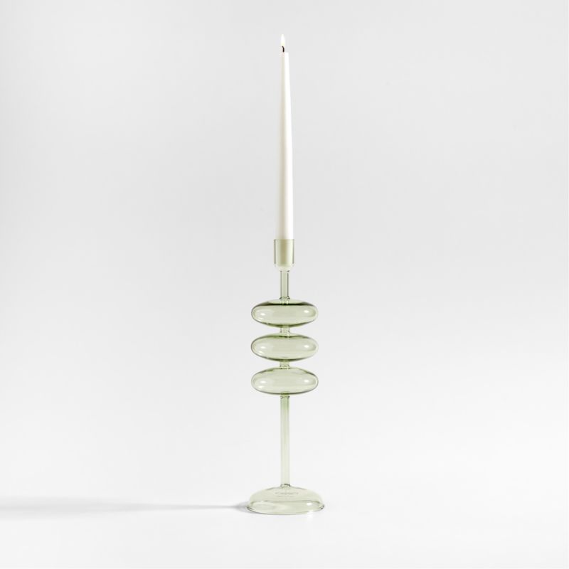 Inspired by mid-century modern glassware, our Venezia candle holders support elongated bubbles on slender stems for a sculptural yet playful silhouette. Crafted of translucent glass in smoky green for a vintage look, the large candlestick supports a taper or doubles as a bud vase for faux or dried stems. We love to layer botanicals with candlelight in a bountiful display. Mix and match our exclusive Venezia candle holders in various heights and hues to extravagant effect on your dining table or mantel.