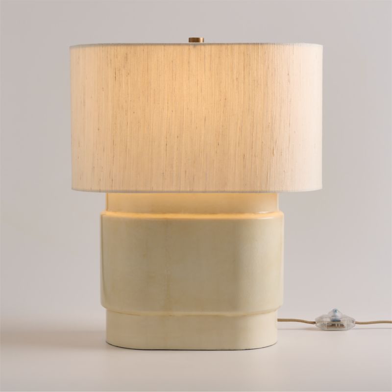 This monochrome lamp keeps all the focus on its remarkable materials. Parchment wraps our sculptural Vestige table lamp, showcasing creamy natural hues. Echoing the base's tiered racetrack curves, the raw silk shade adds organic texture and a soft glow. We especially love Vestige's serene presence and filtered light in a bedroom or foyer.