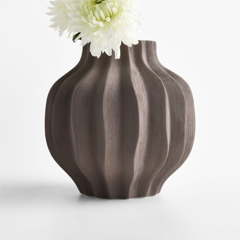 Our Waverly vase fascinates with texture on texture. Hand-formed into deep ripples, durable porcelain shapes the seedpod-shaped vessel. Slender etching adds organic depth and emphasizes the flowing curves. Glazed by hand in cool brown, the medium vase pairs a matte exterior with a dark glossy lining.