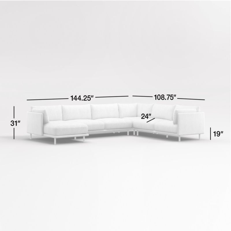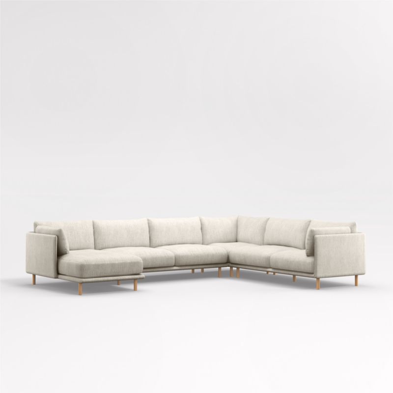 Modern, sophisticated and undeniably inviting, our Wells U-shaped sectional tucks plump cushions onto a slim frame supported by sustainably sourced solid wood legs with a natural finish. Low decks allow plenty of room for indulgent seat cushions that encourage you to linger. Tailored with top stitching and French seams on the cushions and a crisp micro-flange outlining the frames, the soft twill fabric suits active family life and cleans up beautifully. Joining a left-arm chaise, corner, armless sofa and right-arm sofa, our Wells four-piece sectional is a Crate & Barrel exclusive.