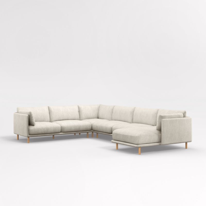 Modern, sophisticated and undeniably inviting, our Wells U-shaped sectional tucks plump cushions onto a slim frame supported by sustainably sourced solid wood legs with a natural finish. Low decks allow plenty of room for indulgent seat cushions that encourage you to linger. Tailored with top stitching and French seams on the cushions and a crisp micro-flange outlining the frames, the soft twill fabric suits active family life and cleans up beautifully. Joining a left-arm sofa, corner, armless sofa and right-arm chaise, our Wells four-piece sectional is a Crate & Barrel exclusive.