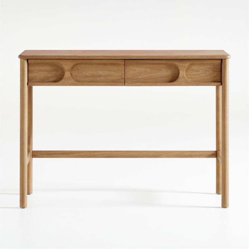 Our Wes collection furnishes your kid's room with a unique mix of soft, organic curves and bold geometric details in natural poplar and oak. The Wes 2-Drawer Desk provides a beautiful and practical spot to study. Mod, capsule-shaped cutouts create hidden handles for two drawers that keep essential school supplies and electronics organized and out of sight. Finished with soft edges, this stylish study space essential is elevated on oversized dowel legs.