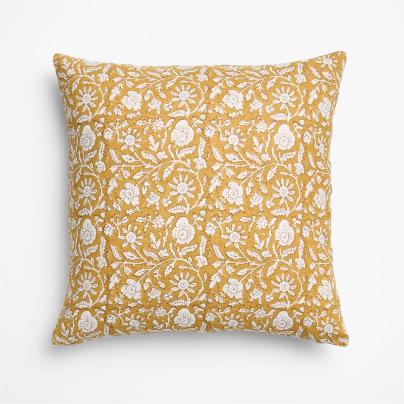 Patterned with an intricate floral motif, our Whitney pillow is made by textile artists who impart the design with traditional carved wood blocks. The reversed-out pattern uses the natural ground of the linen fabric to create the lush botanicals on a backdrop of warm ocher. The square pillow includes your choice of a plush feather-down or lofty down-alternative insert.