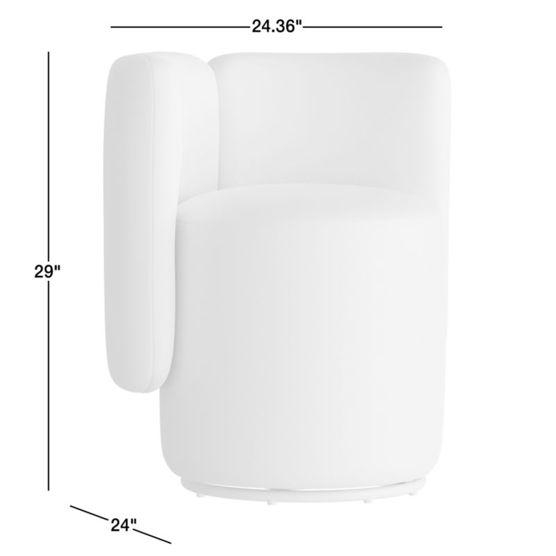 Soft curves inspired by tulips redefine the dining chair in Wills. Offering a fresh take on the barrel chair with contemporary proportions, the split back consists of two curved panels that run down and around to hug the seat in sheltering softness. The cozy-yet-supportive seat shapes a solid cylinder, set on a recessed swivel base that gives you a 360 sweep of the room. A nubby off-white boucle wraps the curves in touch-me texture.