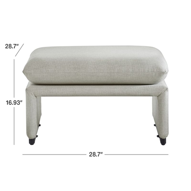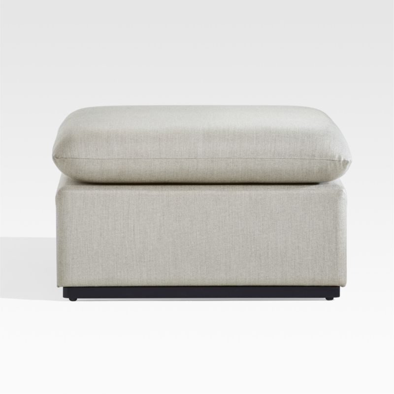 Fully upholstered Zuma brings living-room style outdoors. Knife-edge tailoring of the light grey weather-resistant fabric gives the rectangles and squares that compose this modern ottoman crisp, form-defining edges. The slim yet supportive cushion provides a relaxed footrest or extra seat. To protect the fabric from touching the ground, matte black metal sled feet add a bit of elevation. A new approach to outdoor entertaining, the Zuma collection is a Crate and Barrel exclusive.