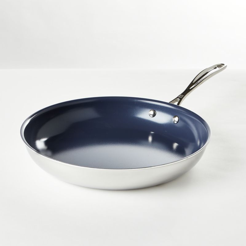 Brown, sauté and fry with this essential pan. A Crate and Barrel exclusive, our fry pan features an aluminum core for quick and even heating clad in mirror-polished stainless steel. Finished with an ultra-durable ceramic non-stick coating in deep blue, this oven-safe pan releases tofu scrambles, caramelized onions and Bananas Foster with ease. The stay-cool handles offers safety, comfort and usability.